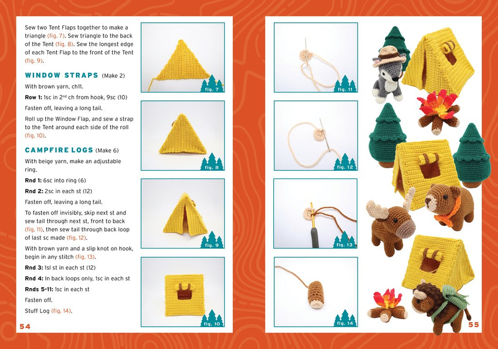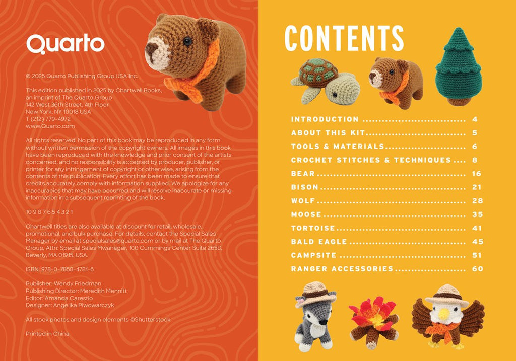 Begin your crochet adventure with a brief review of crochet stitches and techniques. Next, use the included supplies to crochet a bear and a bison, then continue the crochet creativity by following the patterns to make an eagle, wolf, moose, or turtle. The fun doesn’t stop there: dress up your creatures with ranger-themed accessories like a hat, sash, and backpack. Or create a whole camping scene with a cozy fire, tent, and trees.