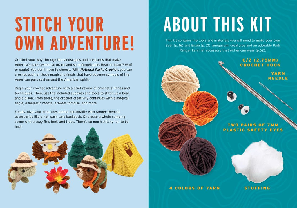 Crochet your way through America’s breathtaking National Parks with this charming kit featuring 8 park-inspired patterns and materials to create your own bear and bison.