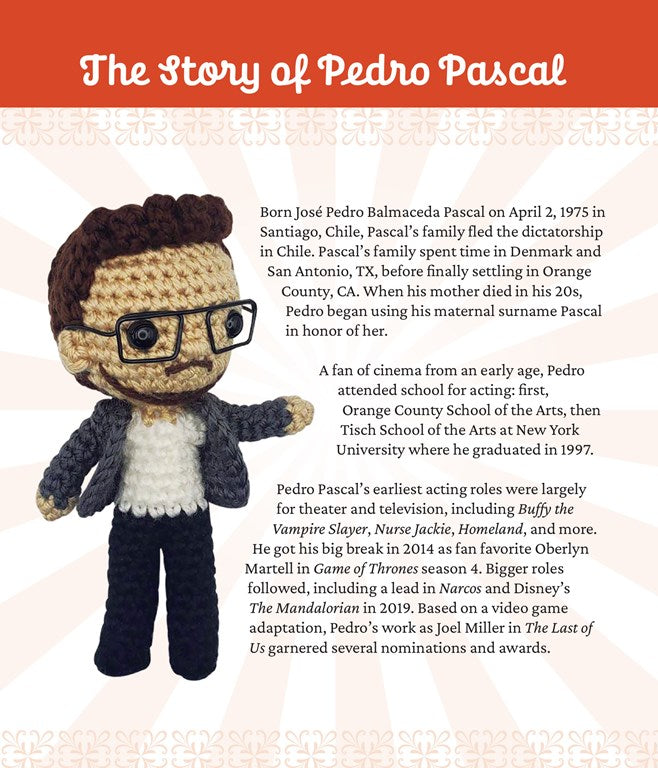 An inspiring actor and advocate, it’s no wonder Pedro Pascal is having his Hollywood moment. And you can get in on the fun with the Unofficial Pedro Pascal Book and Crochet Kit! Start with crochet basics, including techniques and illustrated stitches, then follow along step by step to create Pedro, from his stylish clothes to his signature glasses. Plus, enjoy interesting biographical tidbits along the way.