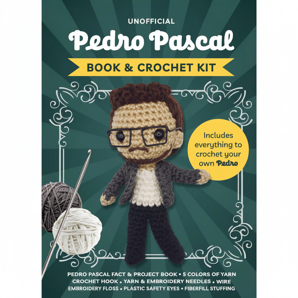 Stitch a Pedro Pascal amigurumi doll with the Unofficial Pedro Pascal Book and Crochet Kit! This fun all-in-one kit includes basic crochet instructions and techniques, full Pedro pattern with photos, yarn, a crochet hook, and more.