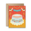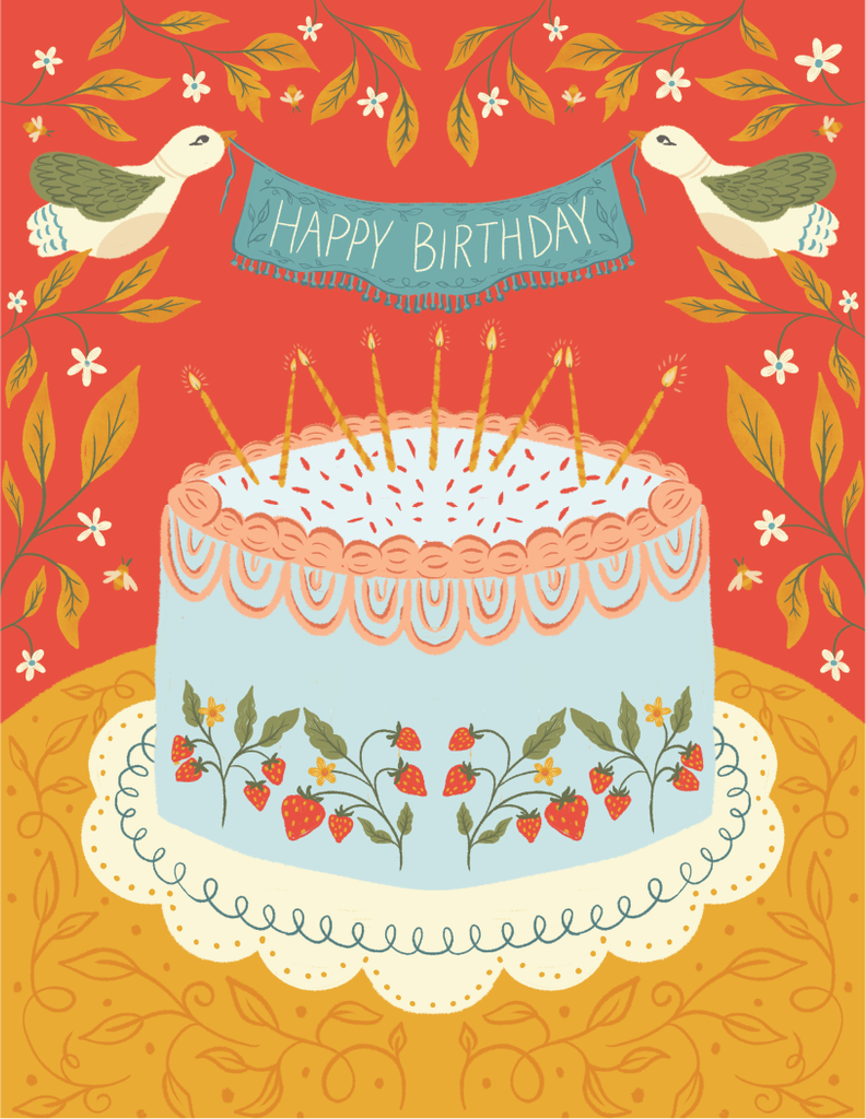 AmicreativeStrawberry Cake is a hand-illustrated birthday greeting card featuring a frosted strawberry cake and two birds holding a “Happy Birthday” banner on a bold red background.