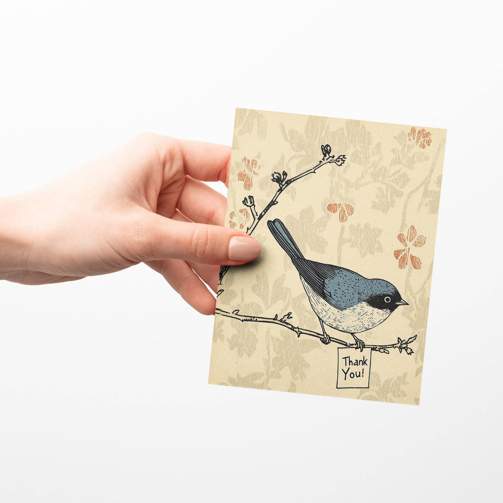 Paper SlamA charming illustration of a delicate bird perched on a branch, holding a tiny “Thank You” sign.