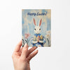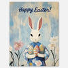 This beautiful card features a regal white rabbit in a floral dress, holding three vibrantly patterned Easter eggs.