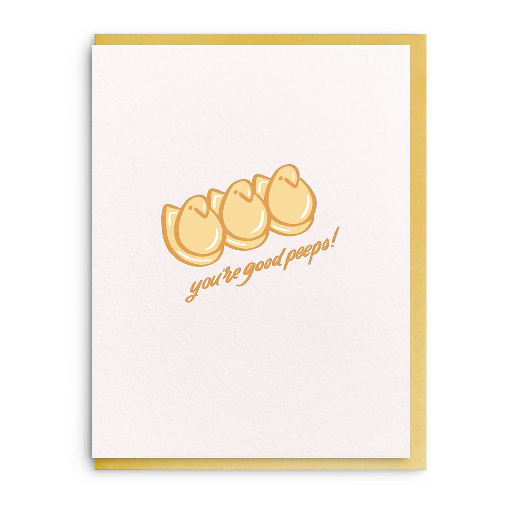 Dahlia PressTELL THEM YOU'RE GOOD PEEPS! This charming greeting card features a playful illustration that’s reminiscent of Easter Peeps candy. The whimsical message is written in a fun, cursive font and is perfect for brightening someone's day or showing appreciation to friends, family, or colleagues. Blank inside for your personal message, this greeting is hand illustrated and letterpress printed on plush paper, and comes with a coordinating envelope.