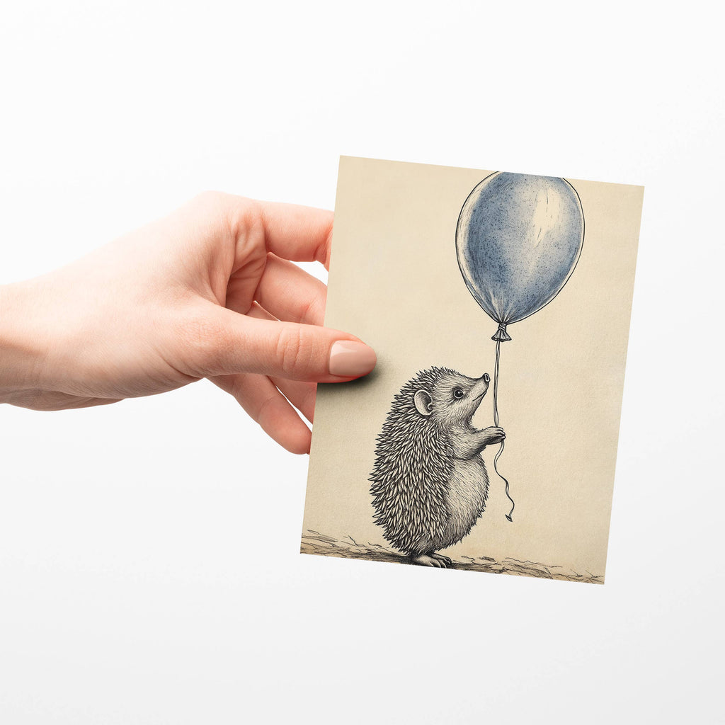 Sweet and whimsical, this charming card features an adorable hedgehog gently holding onto a floating balloon.