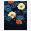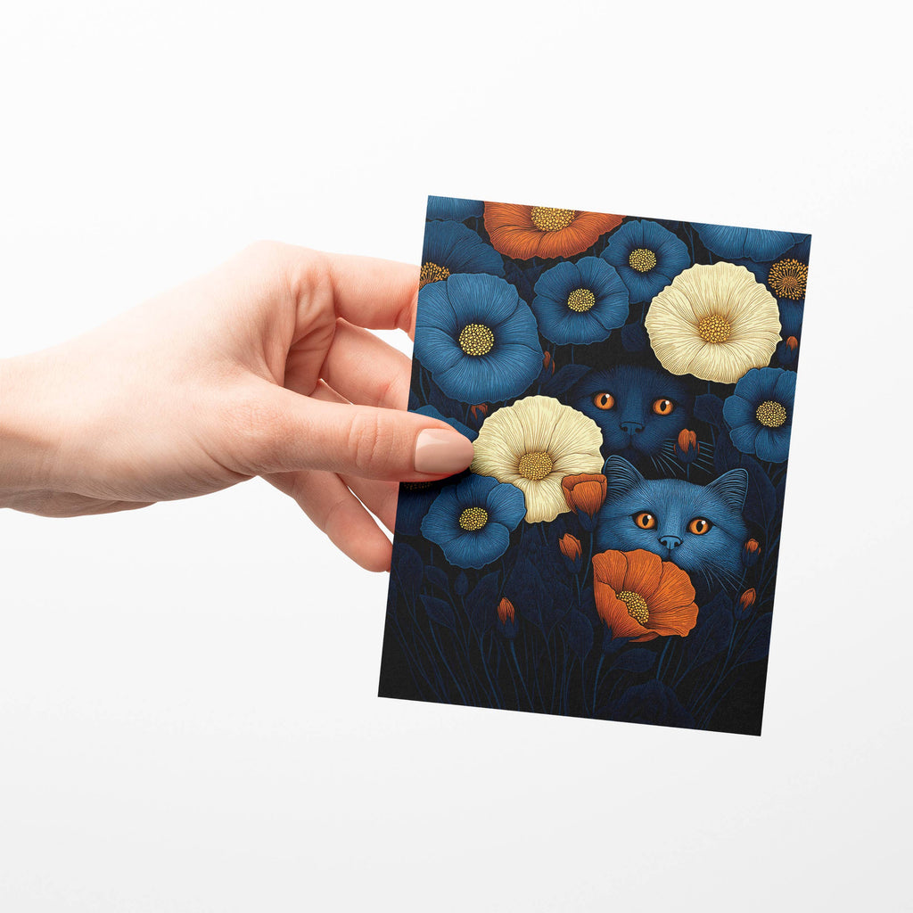 Hidden among a vibrant garden of blue, cream, and orange blooms, a pair of curious cats peeks out with glowing amber eyes—equal parts mystery and charm.