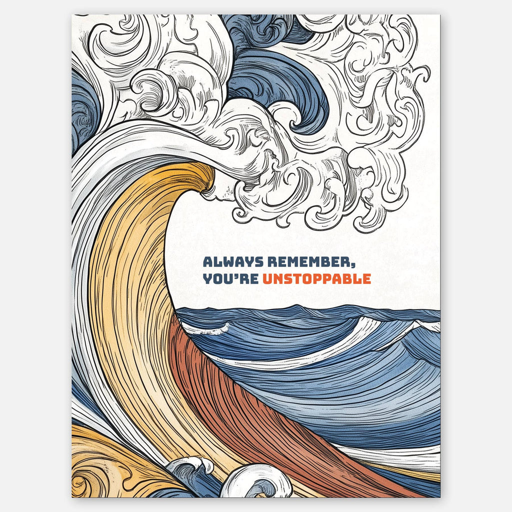 Bold and inspiring, this dynamic card features powerful waves in motion, paired with the uplifting message “Always remember, you’re unstoppable.”