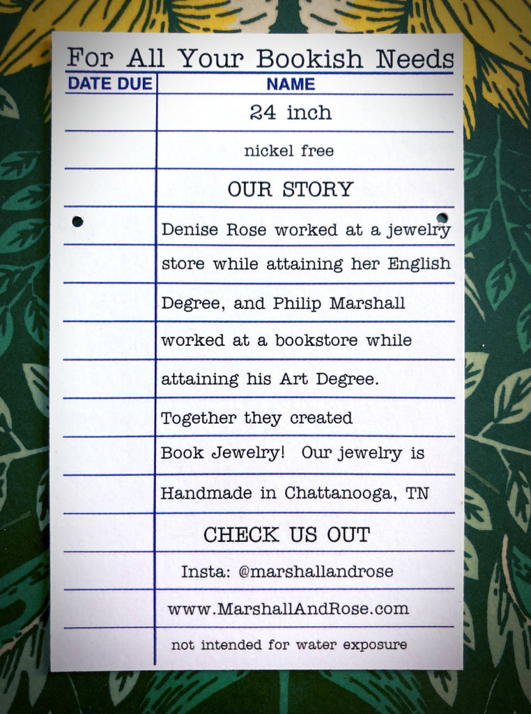 Marshall and RoseOur book lockets are made with nickel free materials and feature the most beloved classic and modern books! They are on 24-inch chains and are sealed with a gloss finish for durability.