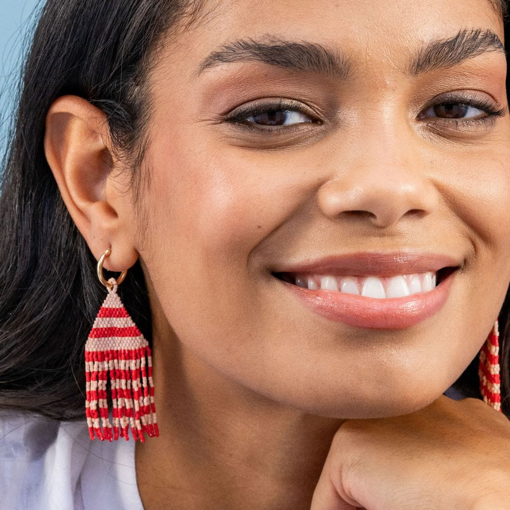 James Mini Gold Hoop Two Tone Stripes Beaded Fringe Earrings - Poppy