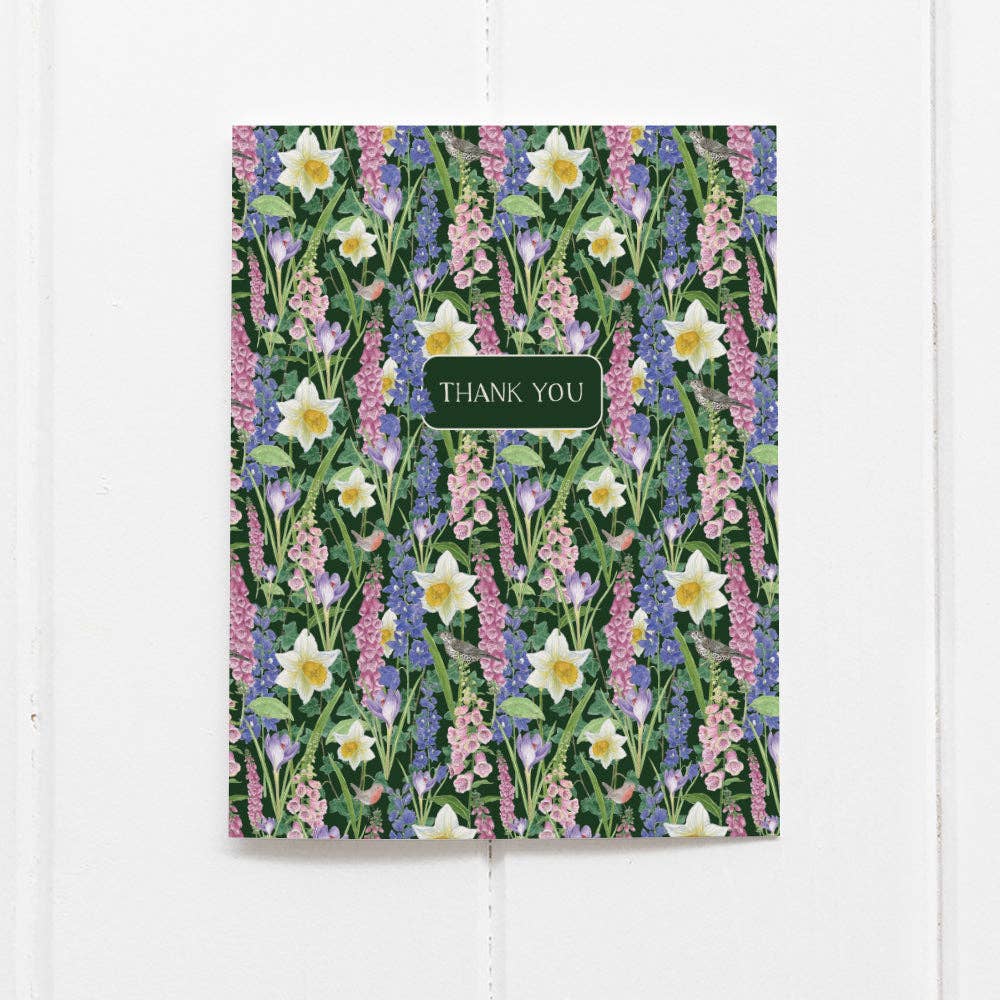 Express your gratitude with this beautifully crafted thank you card adorned with a vibrant watercolor tapestry of spring blooms. Daffodils, crocuses, delphiniums, and foxgloves fill the design in the ornate style of William Morris and Victorian wallpaper, while birds nestle discreetly among the flowers.