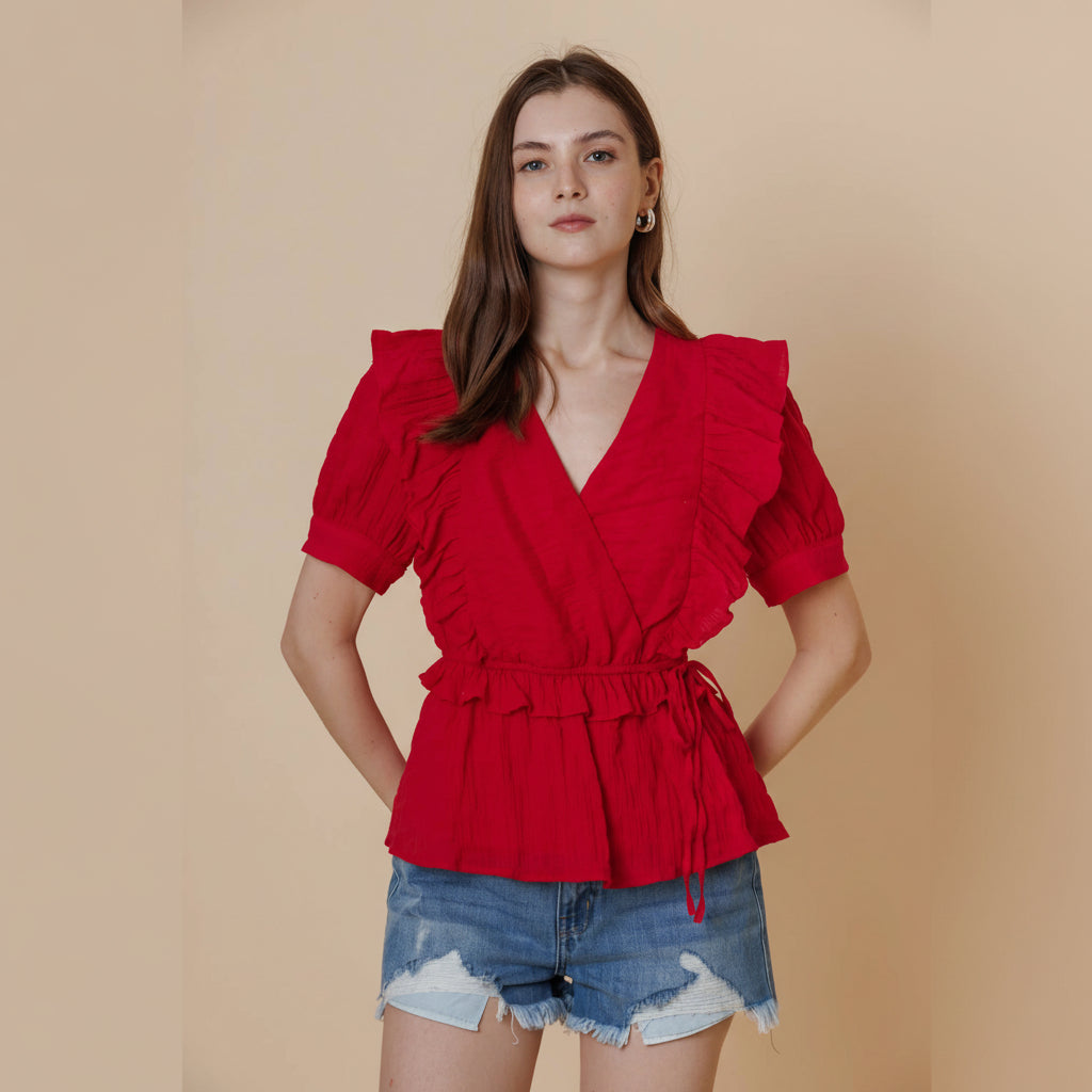 A & SHEA romantic wrap-style blouse featuring delicate ruffled sleeves and a subtle textured finish. Designed with a surpliced V-Neckline, side tie waist, and feminine silhouette, this piece effortlessly transitions from casual to dressy.