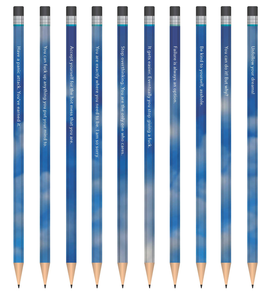 The Disappointing Affirmations pencil set includes ten eraser-topped graphite pencils.