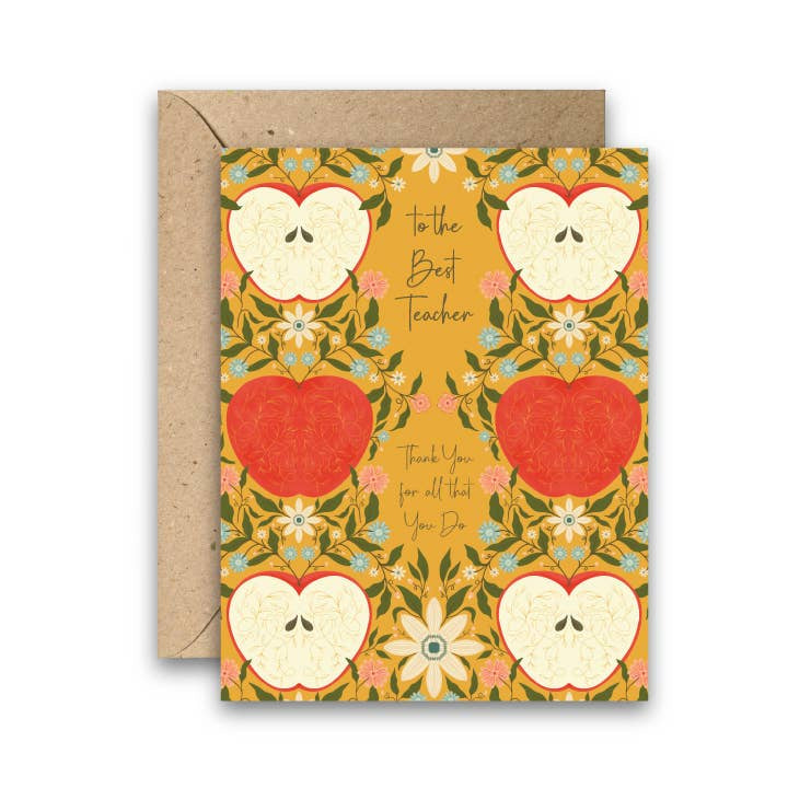 AmicreativeGolden Teacher features illustrated red apples and soft florals on a warm golden background with the message, “To the Best Teacher – Thank You for All That You Do.”