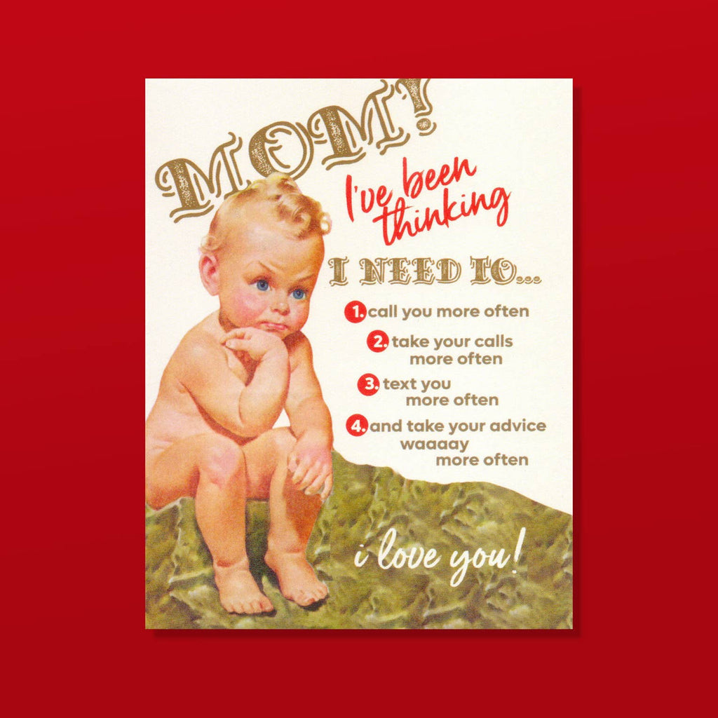 "I've been thinking, and I promise to call you more often, take your calls more often, facetime you more often, and eyeroll less often... I LOVE YOU!" Mom's Little Thinker. Mother's day card for the kids that need to keep in touch longer!