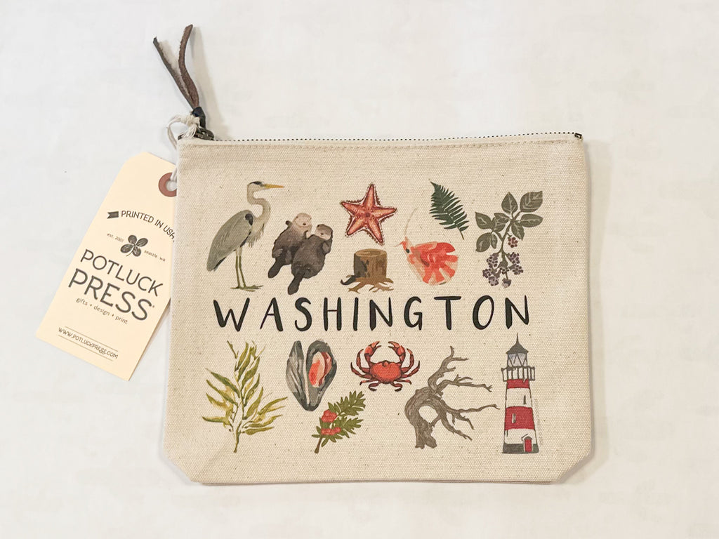 Canvas pouch featuring the icons of Washington. Perfect for travel, school, or toiletries.