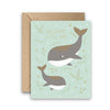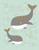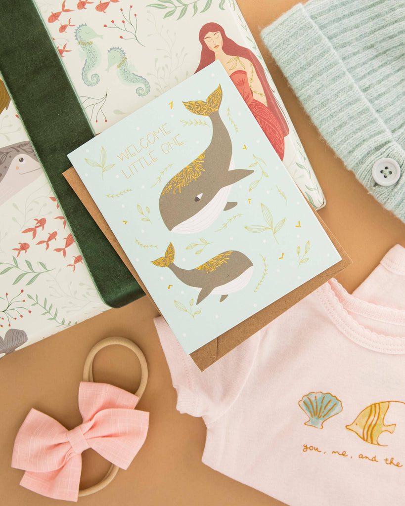 AmicreativeWelcome Little One features a hand-illustrated parent and baby whale swimming through soft underwater greenery, with a gold foil message that adds a subtle, celebratory glow.