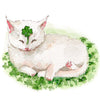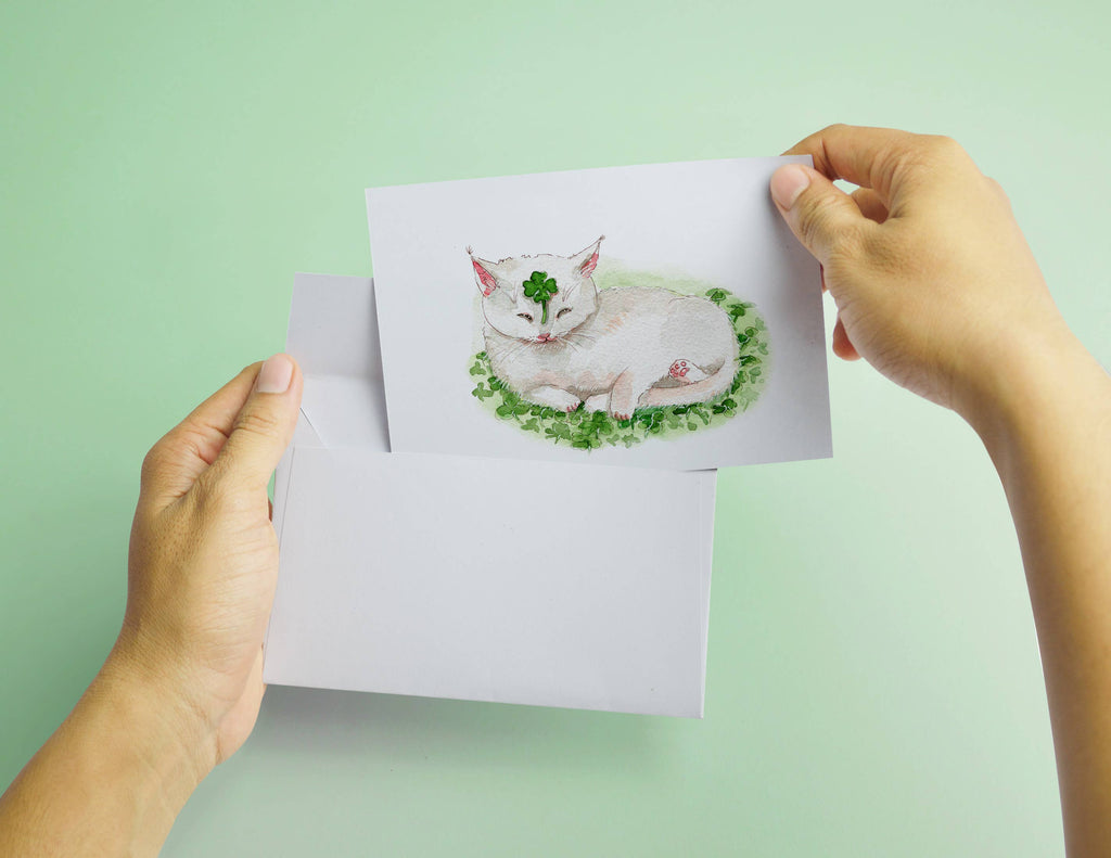 Liyana StudioLucky four-leaf clover on cat's head in a clover field. This beautiful sentimental clover cat card is the perfect St. Patrick's day card for spring season.