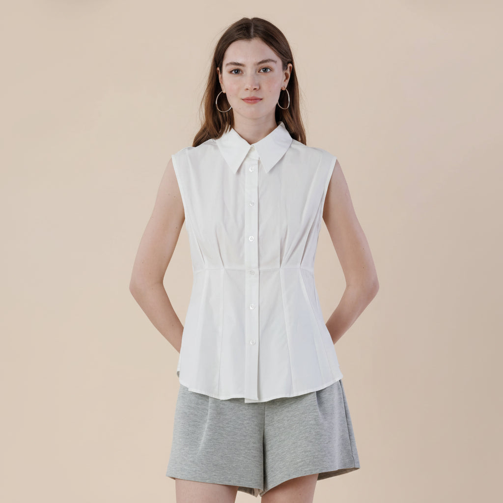 Sleeveless Cotton Poplin Pleated Shirt W/Collar