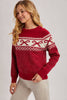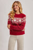 This is a charming and festive holiday sweater. Its most prominent feature is a wide, cream-colored band across the chest and upper arms, adorned with a repeating pattern of cheerful red bows. Below this, a thinner geometric band adds traditional detail, while the main body and sleeves are scattered with tiny cream-colored dots against the vibrant red and green background.