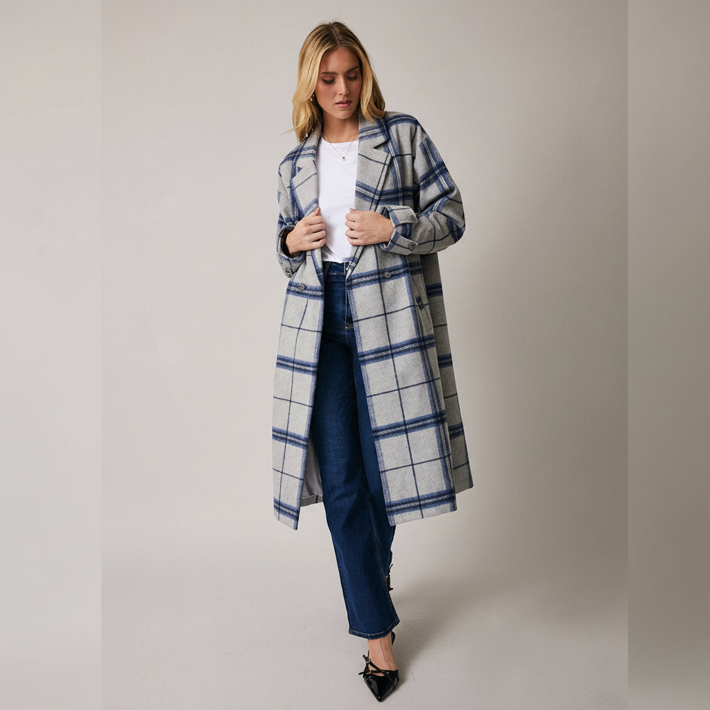 Sunday Edition by LE LISWrap yourself in timeless style with this double breasted plaid coat featuring a sophisticated grey and blue pattern. The classic plaid design brings visual interest while the structured double breasted front adds polish to any outfit. Perfect for layering over your favorite sweaters or dresses, this versatile coat transitions seamlessly from casual weekend strolls to more polished occasions. The rich color palette complements a wide range of wardrobes, making it an easy go-to piece when you want to look put-together without trying too hard.