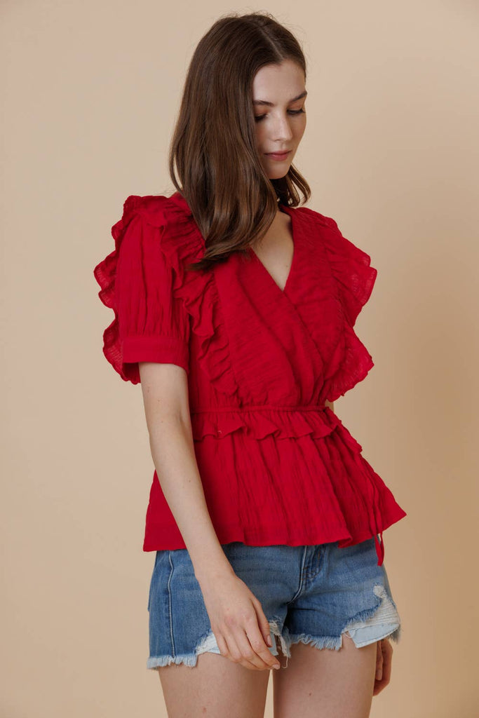 A & SHEA romantic wrap-style blouse featuring delicate ruffled sleeves and a subtle textured finish. Designed with a surpliced V-Neckline, side tie waist, and feminine silhouette, this piece effortlessly transitions from casual to dressy.