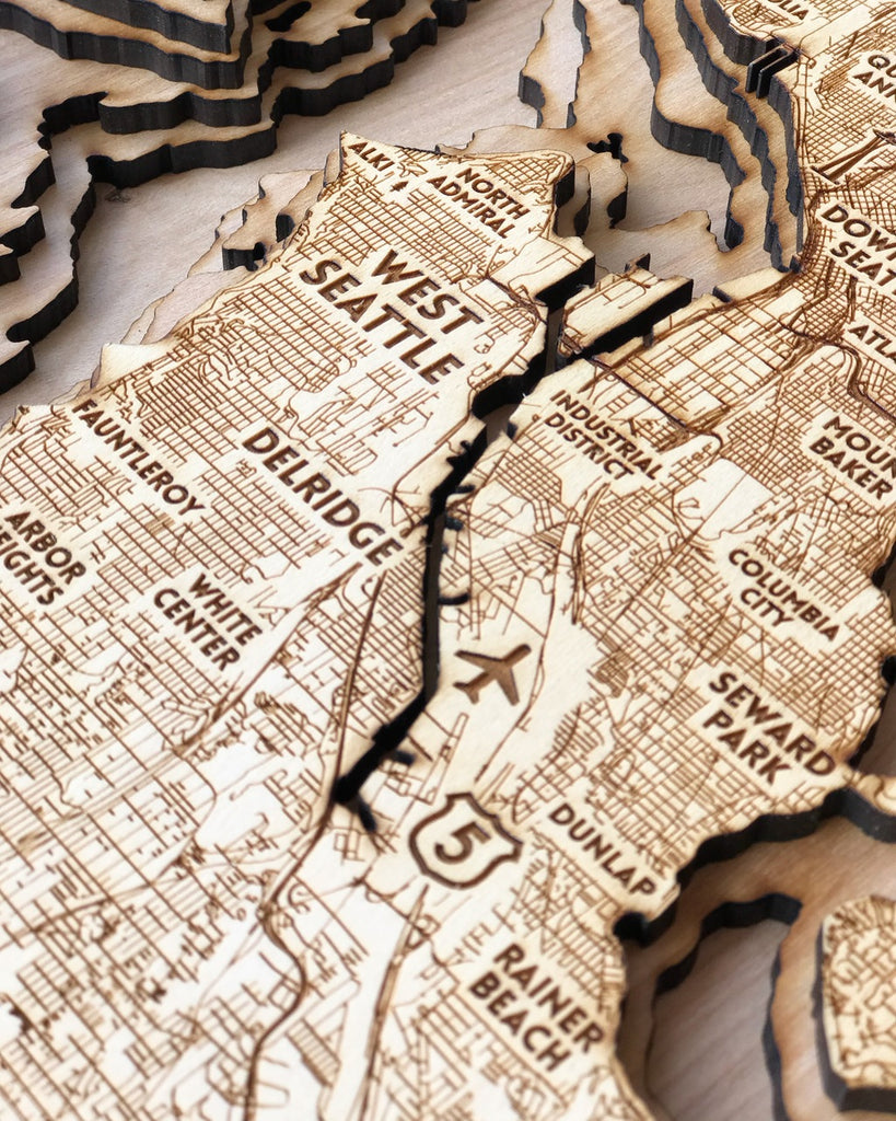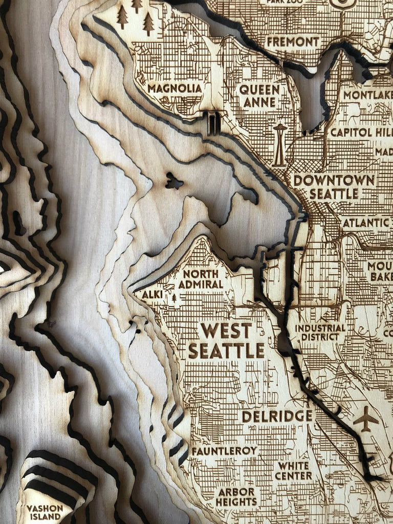 The Seattle 3D wood map is one of our most detailed pieces with over 10,000 individual lines carved into wood.