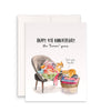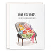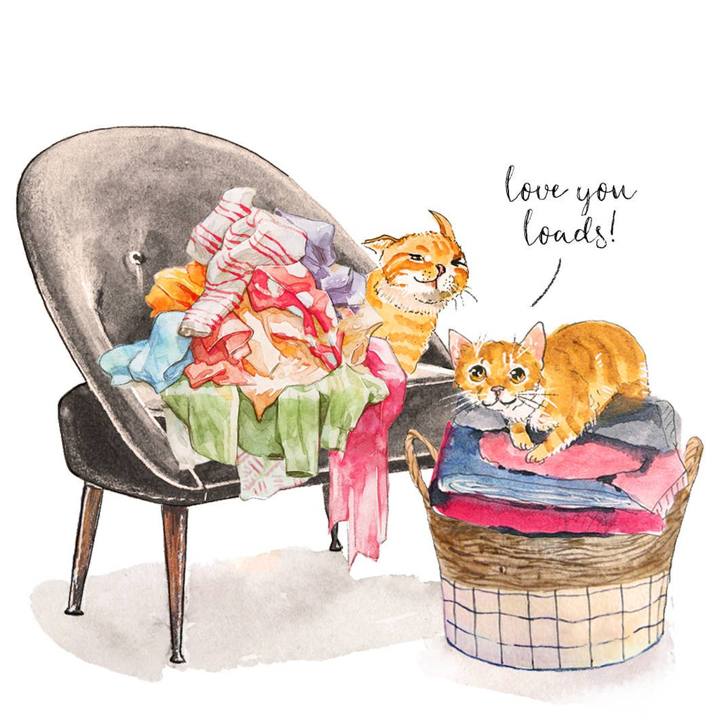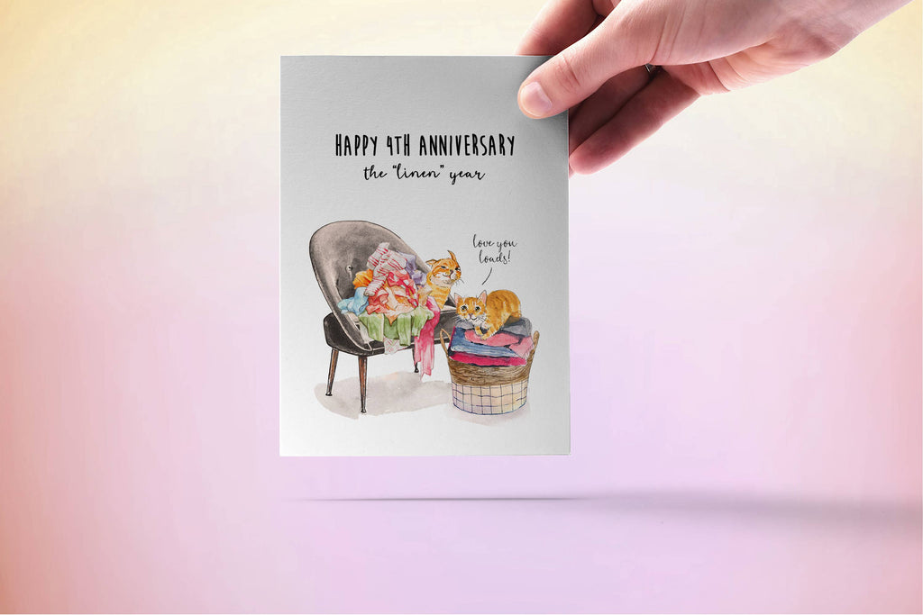 "Love You Loads." This funny cat folding linen sheets card is a unique anniversary card to celebrate your loved one.