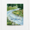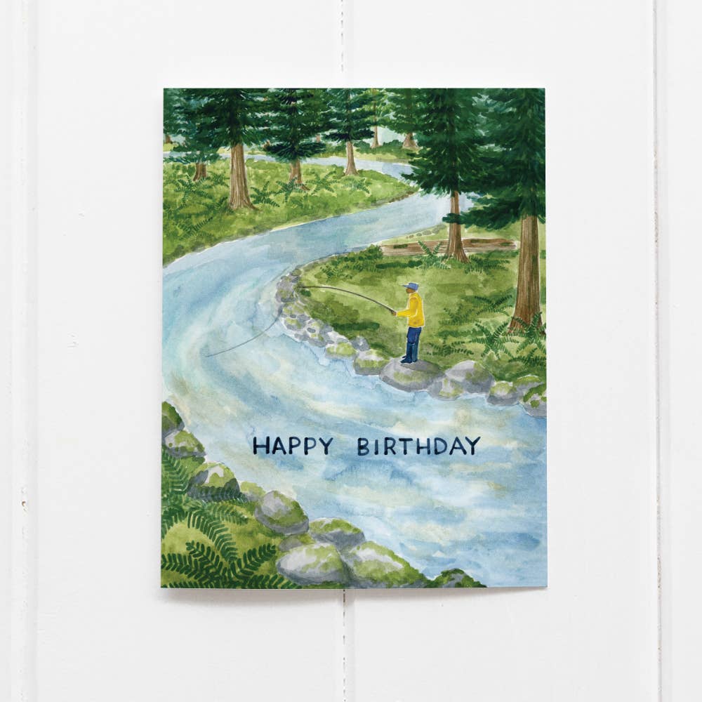 YardiaThe Happy Birthday fishing card features a watercolor illustration of a fisherman on a river.