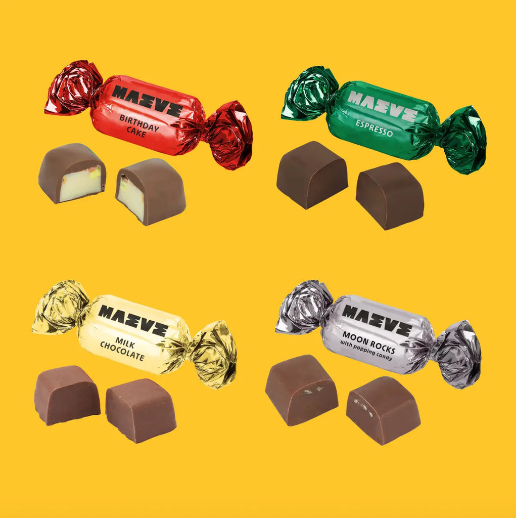 Flavors: Birthday Cake, Espresso, Milk Chocolate, and Moon Rocks bonbons.
