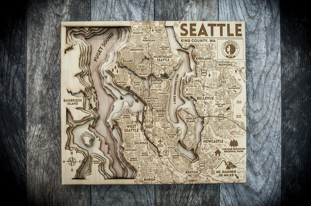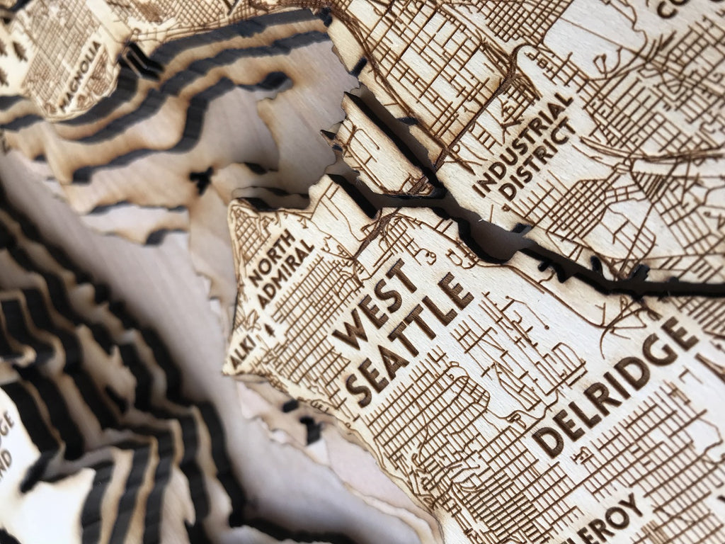 The Seattle 3D wood map is one of our most detailed pieces with over 10,000 individual lines carved into wood.
