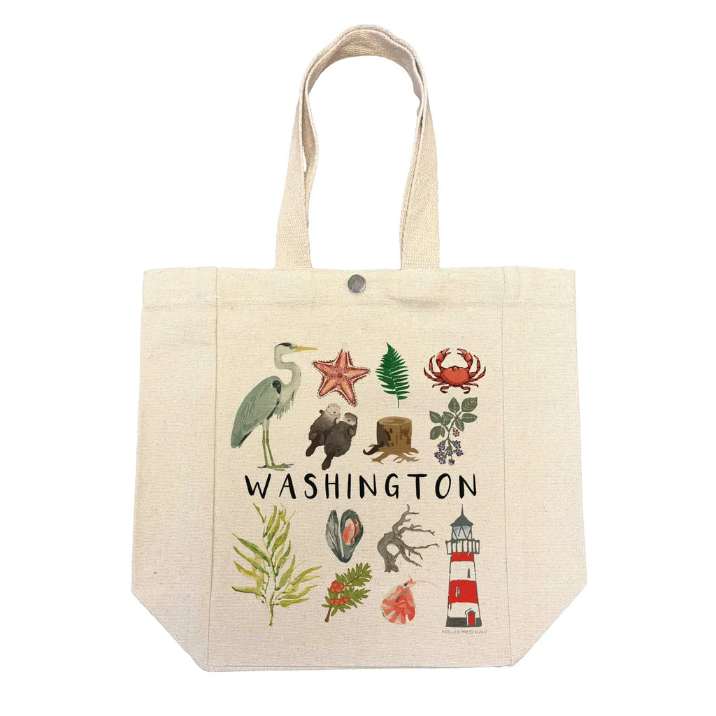Potluck PressCelebrate the stunning natural wonders of Washington State with this charming, illustrated tote. Featuring hand-drawn icons of regional flora and fauna—like otters, herons, starfish, ferns, and even a classic red lighthouse—this design brings together the magic of the PNW in one beautifully earthy canvas.